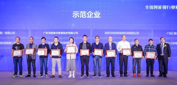 △頂固公司代表(左二)上臺(tái)領(lǐng)取“全國(guó)智能鎖行業(yè)質(zhì)量提升行動(dòng)示范企業(yè)”榮譽(yù)